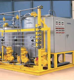 循環冷卻水加藥系統,根據循環冷卻水的濃縮倍數,通過電導率儀檢測循環冷卻的電導率(指標為水的含鹽量)達到一定數值后,控制電磁閥打開,循環冷卻水系統開始排放污水,在排放污水的同時向水中補加新鮮的水,同時向水中投加緩蝕阻垢劑(其投加濃度根據水質和緩蝕阻垢劑的種類)。由于循環冷卻水的堿度偏高,可以通過自動加酸裝置調節其PH值。通過向水中比例投加殺菌滅藻劑,控制循環冷卻水的細菌和粘泥的增長。